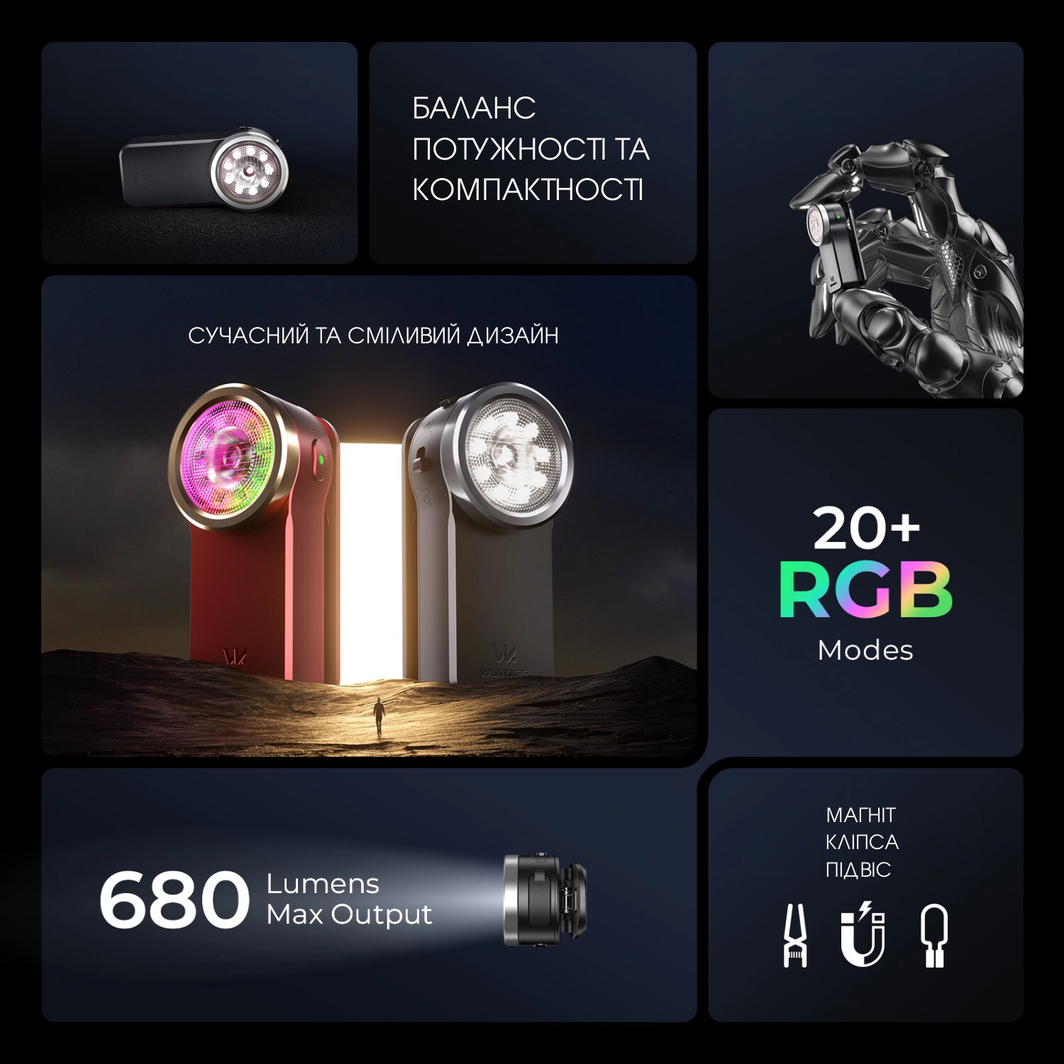 Ліхтар обладнаний двома окремими білими світлодіодами — один створює сфокусований промінь (до 680 люменів), інший — широке м’яке світло (до 320 люменів), ідеальне для читання, кемпінгу чи роботи на близькій відстані. RGB-режим дозволяє перемикатися між червоним, зеленим, синім світлом та ефектами, що стане у пригоді як для нічної навігації, так і для створення атмосфери.