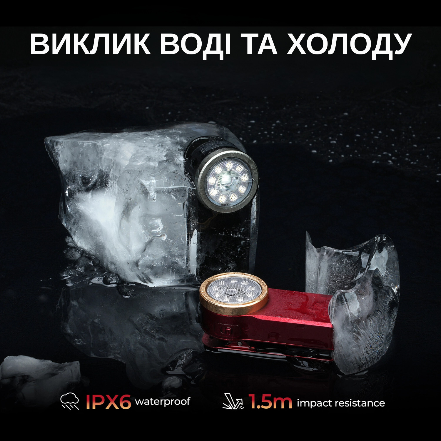 Живлення забезпечується вбудованим акумулятором з зарядкою через порт USB Type-C. Стабільна подача струму підтримується завдяки buck-драйверу. Захист корпусу відповідає стандарту IPX6 — ліхтар не боїться дощу та бризок.