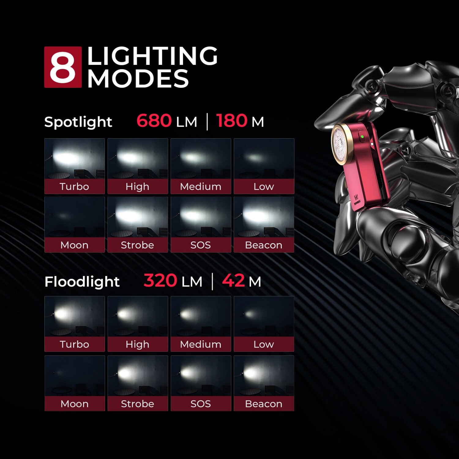 Два типи світла — потужне сфокусоване проміння до 680 лм (Spotlight) та м’яке розсіяне світло Flood із CRI ≈ 95, що ідеально передає кольори в темряві