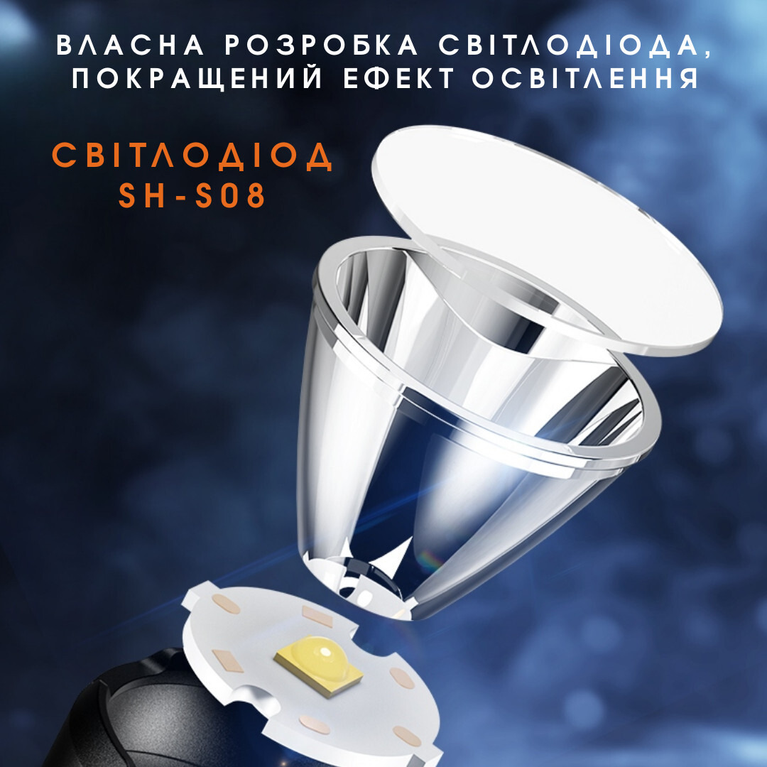 • Режими роботи: Low — Medium — Strong — Strobe — SOS