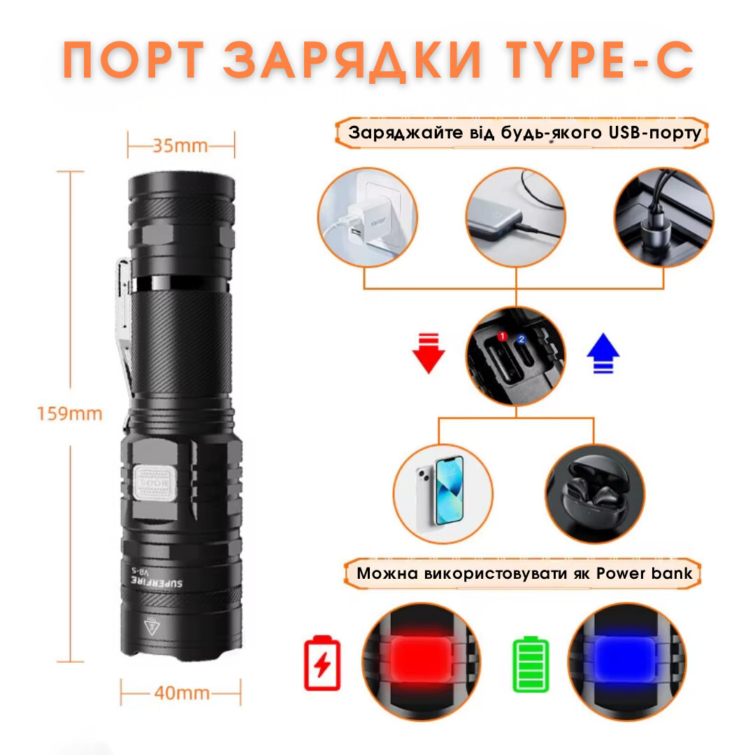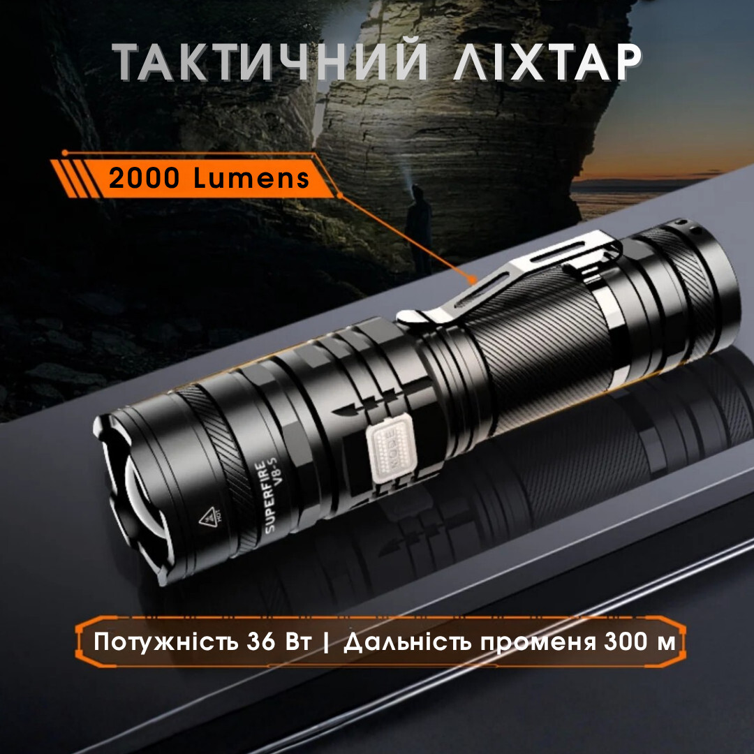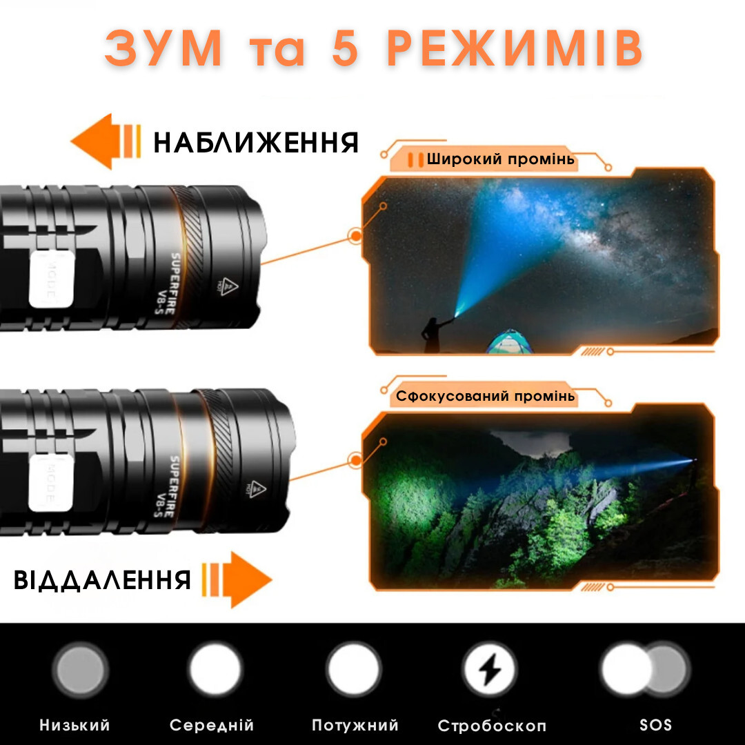 Ліхтарик підвищеної автономності з адаптивним фокусом SuperFire V8-S