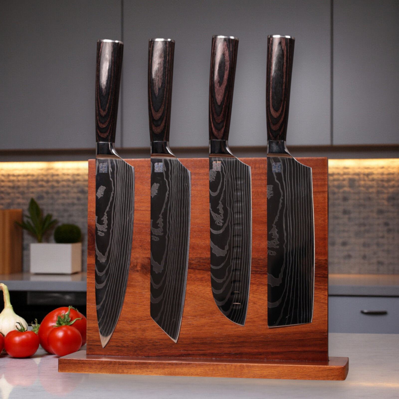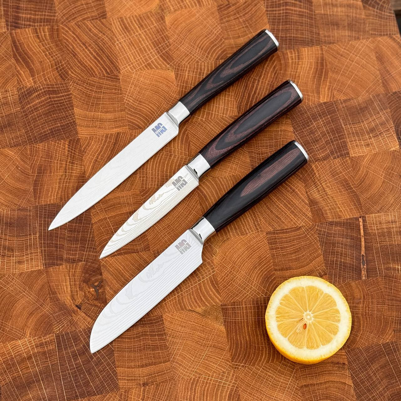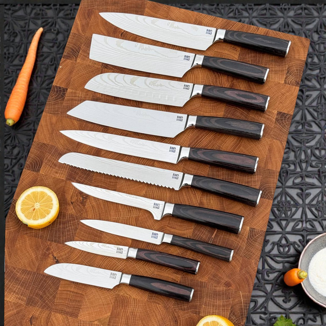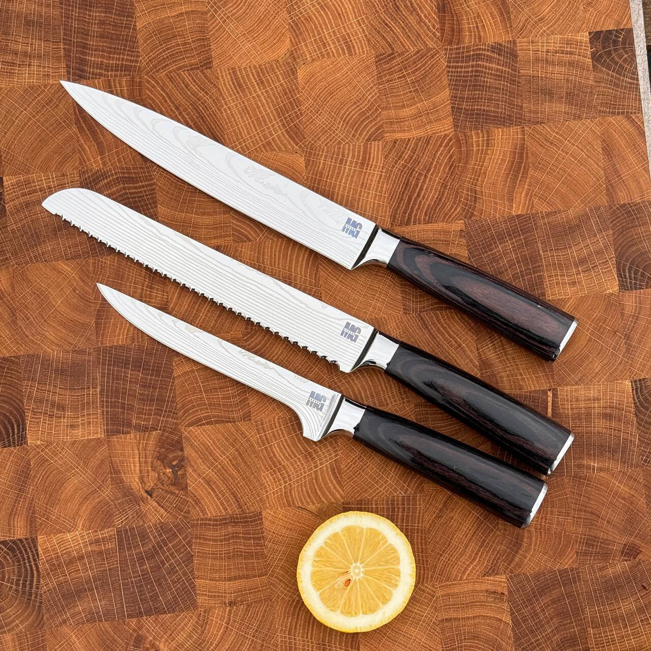 Всі ножі виготовлені з нержавіючої сталі 7cr і загартовані до 57-58 HRC. Це забезпечує їм високу міцність та довговічність. Насолоджуйтеся готуванням з цим різноманітним набором ножів!