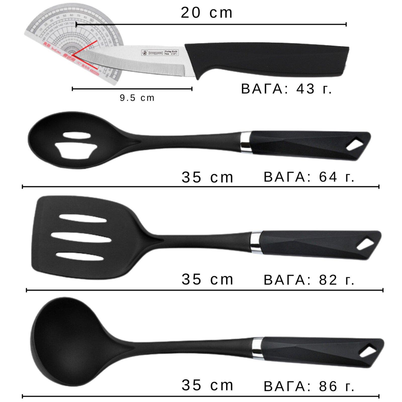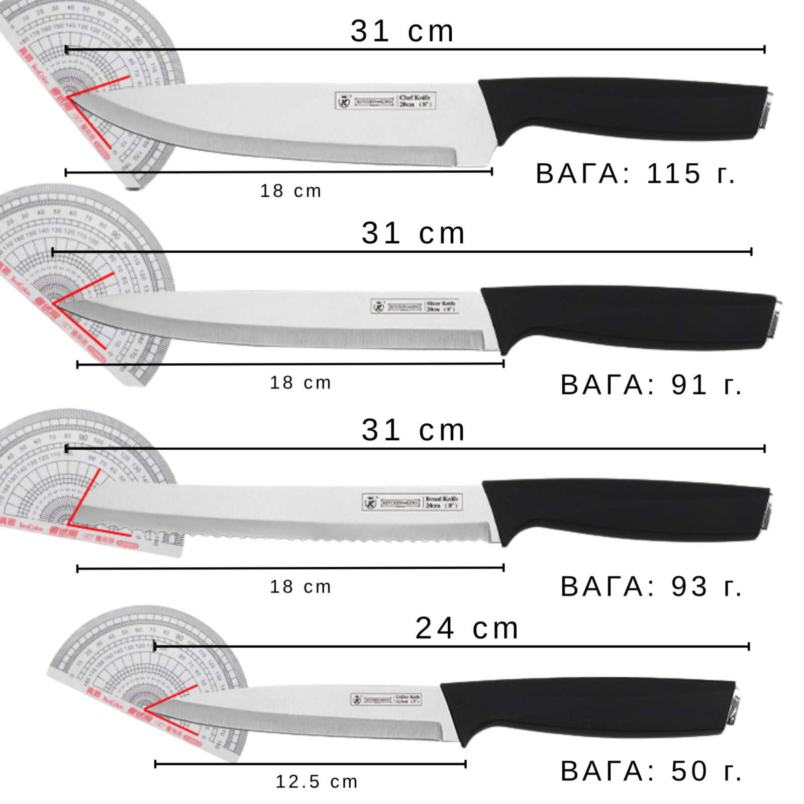 – Ніж для нарізання — 31 см (18 см лезо), 91 г