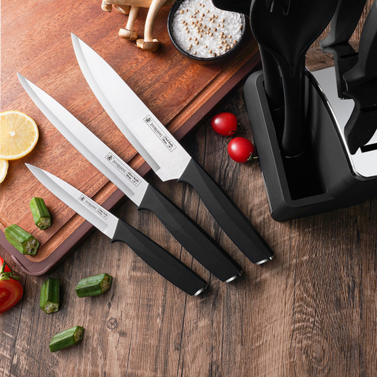 Функціональний набір для сучасної кухні, що поєднує стиль, ергономіку та практичність. У комплект входить п’ять ножів із нержавіючої сталі 3Cr13, три кухонні аксесуари та стильна підставка для зручного зберігання. Гладке лезо забезпечує чистий зріз, а цупка ручка гарантує комфорт і безпеку під час роботи.