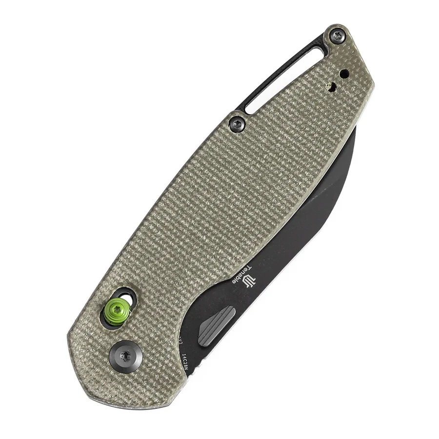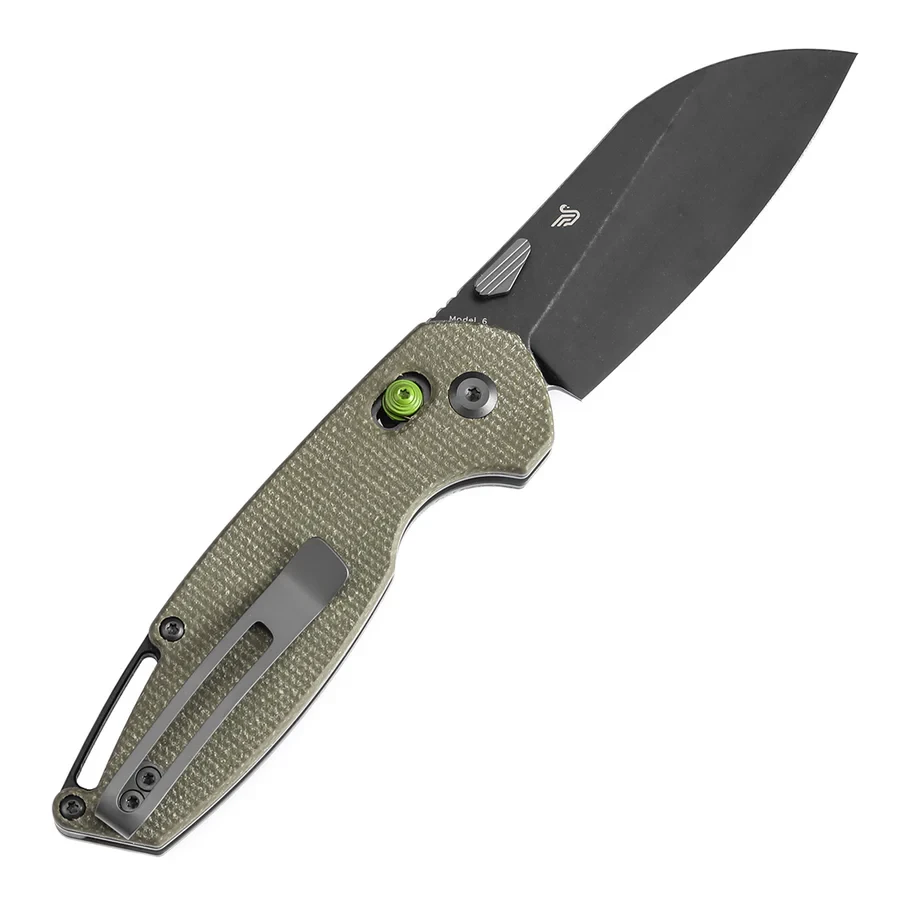 Tenable Model 6 T1022V2 — складаний ніж із клинком форми Sheepfoot у фініші Blackwash. Геометрія клинка забезпечує контрольований різ і зручну роботу з пакуванням, картоном, мотузкою та іншими матеріалами. Руків’я з зеленої Micarta має текстуровану поверхню та комфортні фаски для надійного хвата. Оснащений замком Cross Bar Lock та комплектується запасними пружинами.