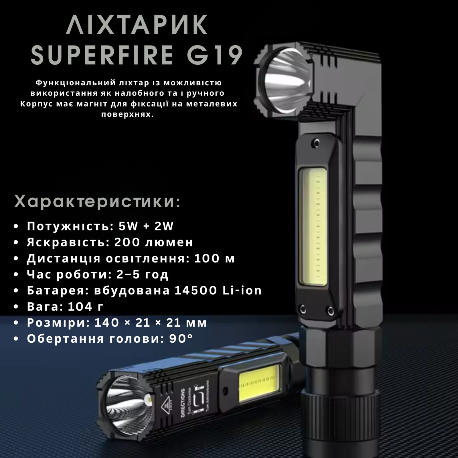 Ліхтарик з поворотним механізмом 2в1 (Ручний – Налобний) SuperFire G19