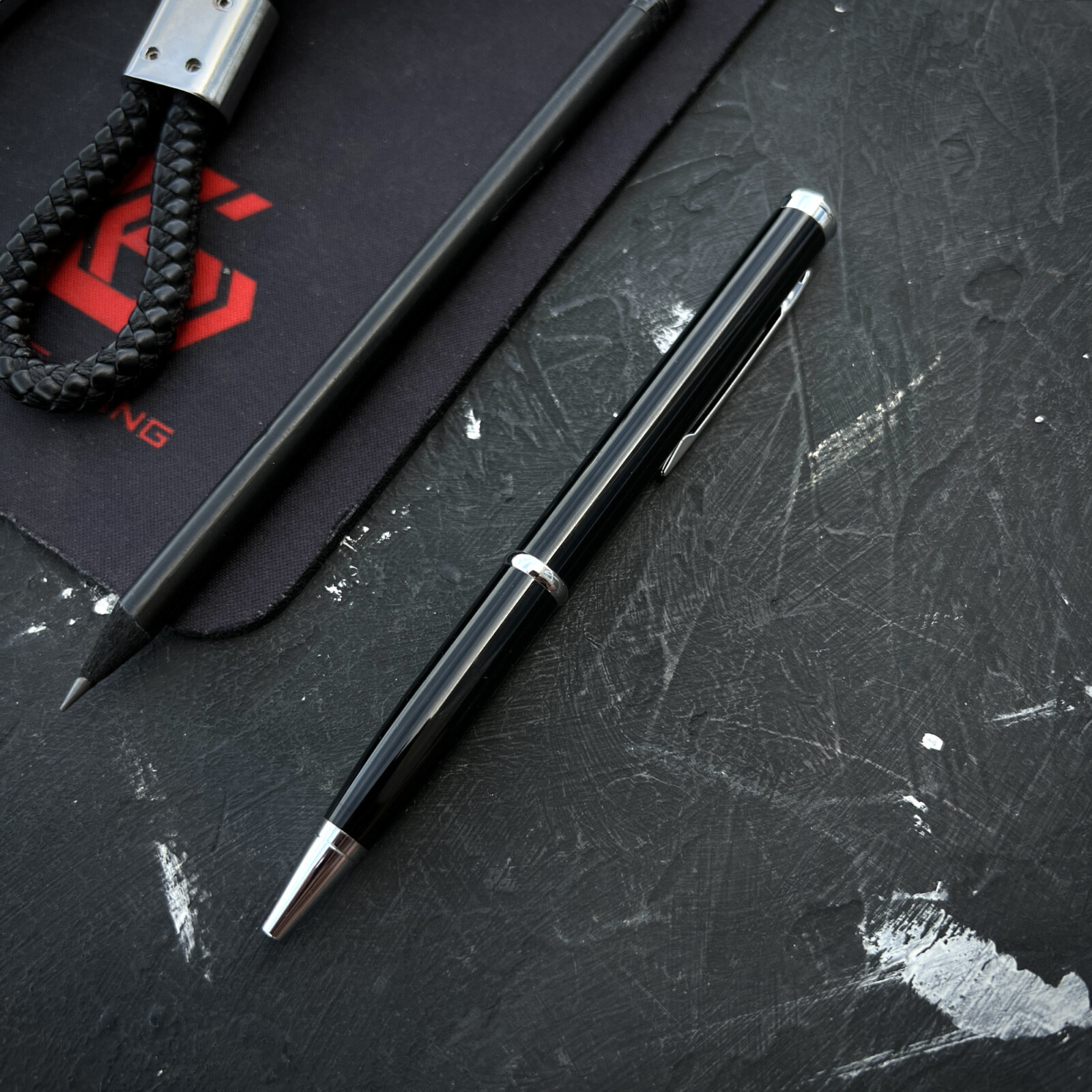 Класична металева ручка з коротким чорнильним стержнем. Складається з двох частин, в другій половині знаходиться клинок, яким зручно виконувати повсякденні завдання. Можна закріпити на кишеню, листок чи зошит.