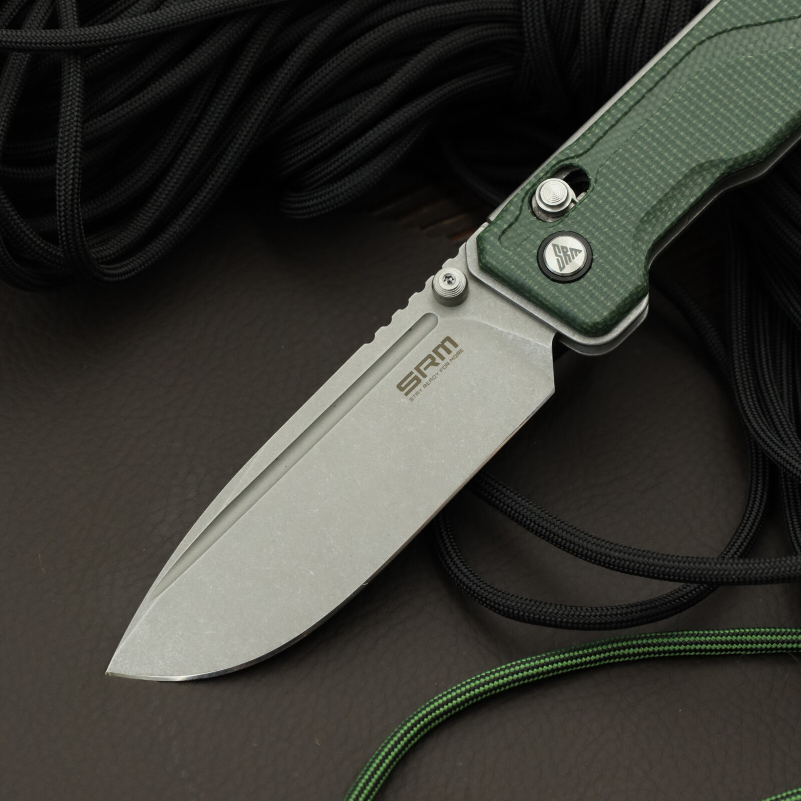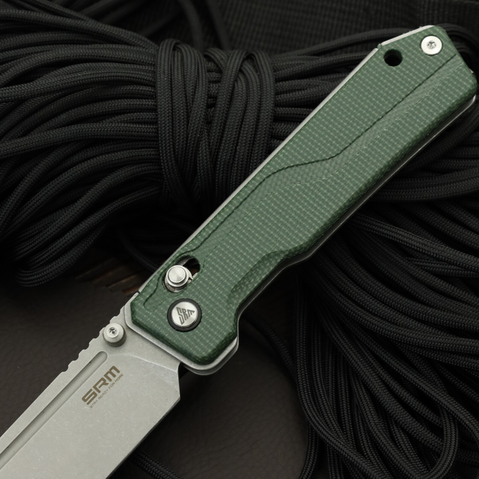 SRM Rubik — складний ніж з клинком з сталі 14C28N твердістю 57–59 HRC, обробленим за технологією Cooled Sharpening, що забезпечує довговічність і гостроту леза.