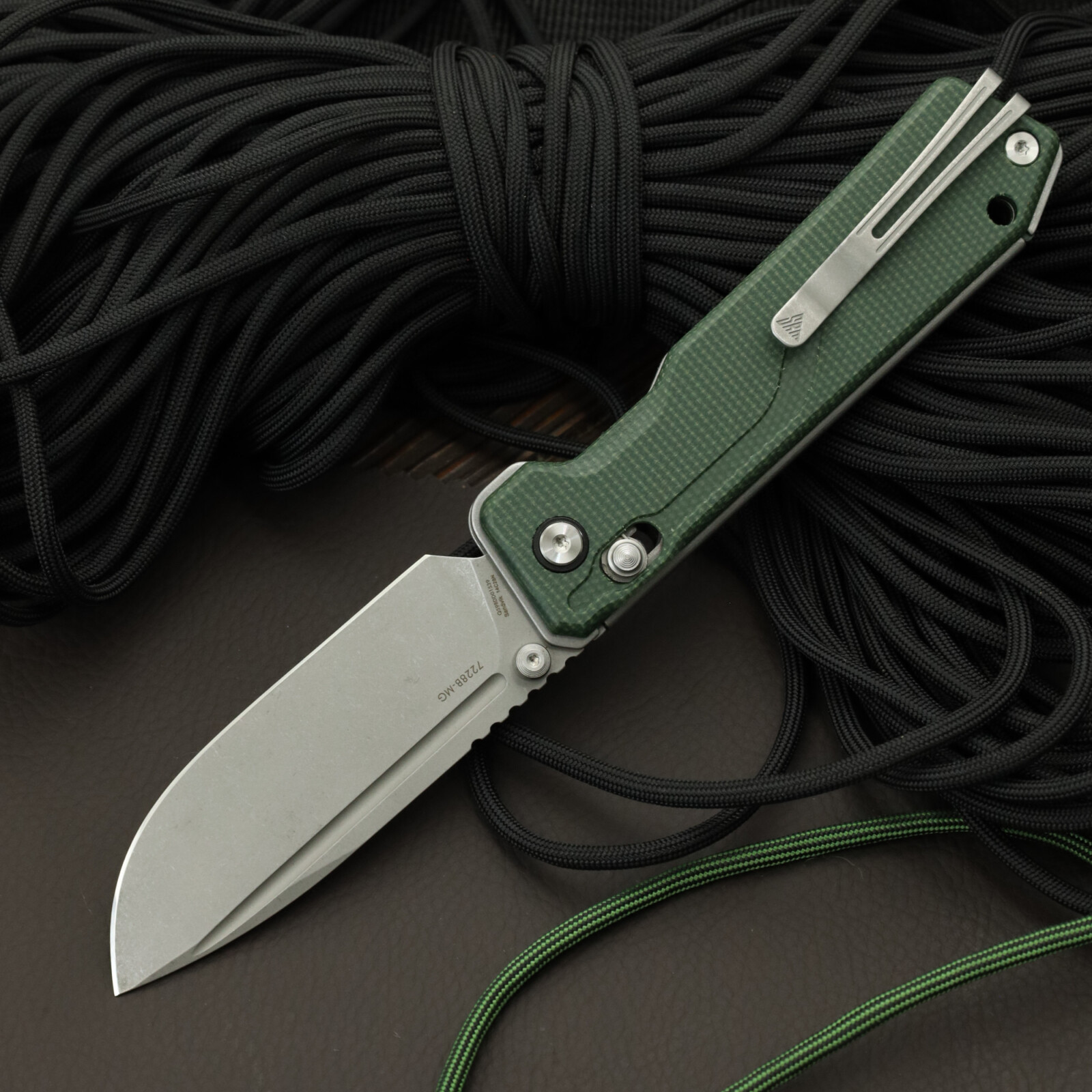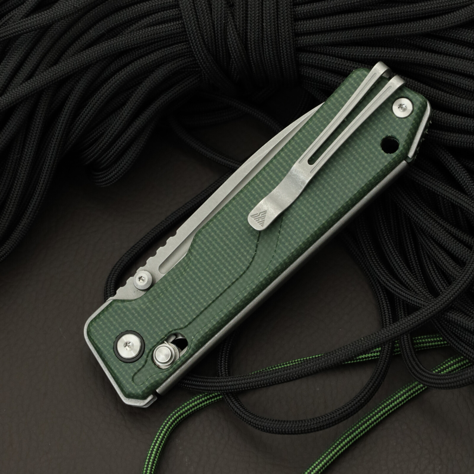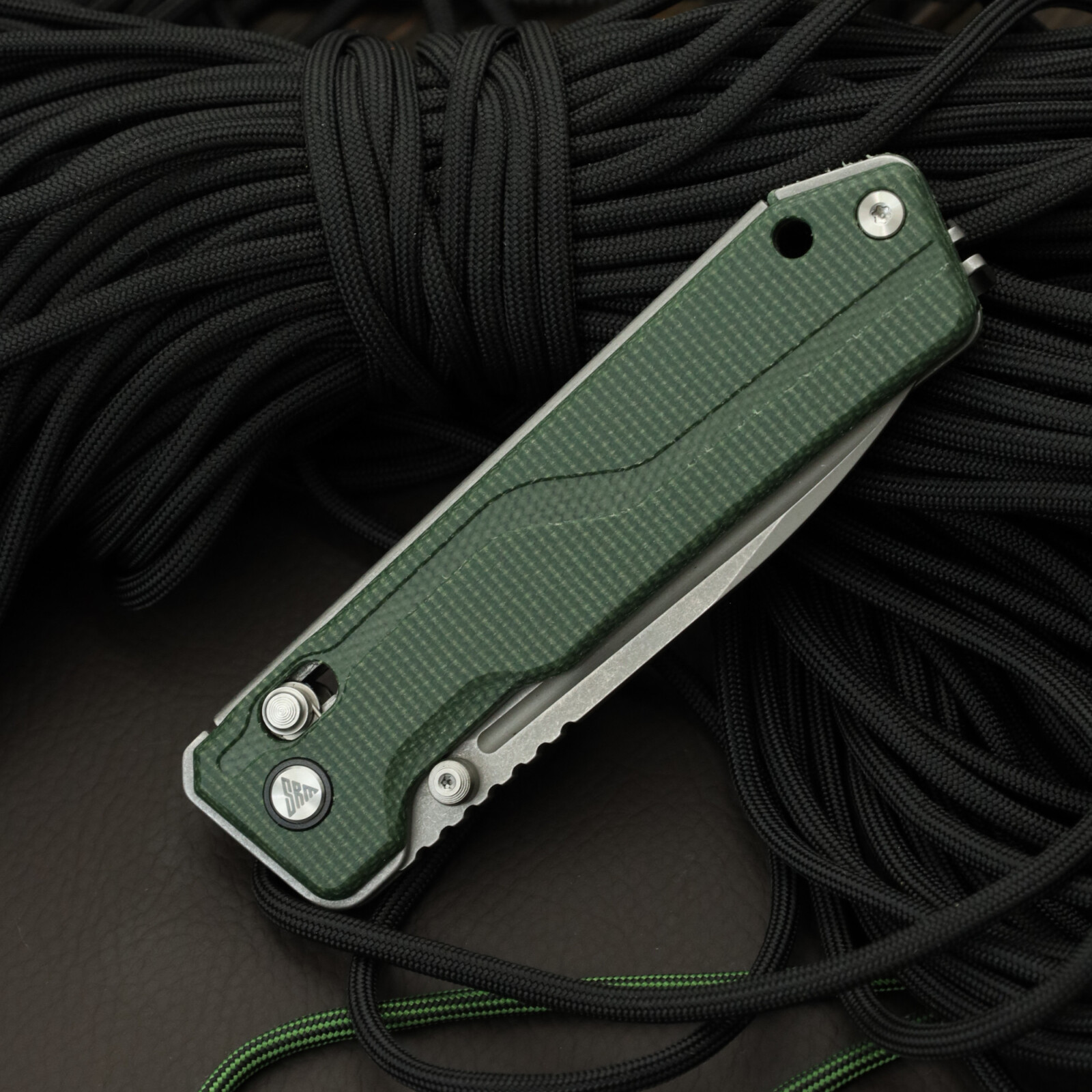 Руків’я виготовлене з міцної зеленої Micarta, яка забезпечує впевнений хват і довговічність.